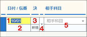 | 2 | 伝番 | 入力を確定すると、自動的に仕訳の伝票番号が振られます。伝票番号設定にて手入力を選択している場合は半角6桁までの数字を入力できます。 |