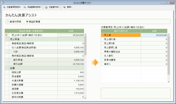 - 「かんたん決算アシスト」は、青色申告決算書や収支内訳書(白色申告)の各項目に集計されている科目や金額の確認、また修正・入力ができる帳簿へ移ることもできる今までにない新機能です。