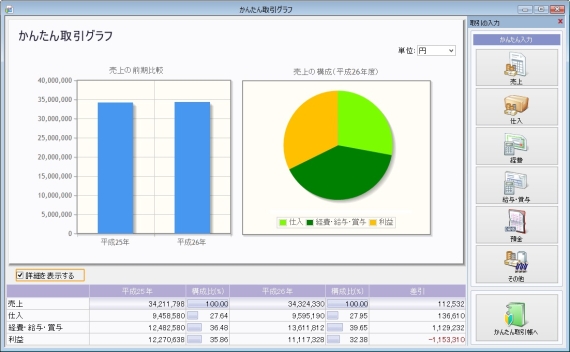 - 「かんたん取引グラフ」は、誰でもわかりやすいビジュアル表示で、現在の経営状態と売上げの前年比をひと目で確認することができます。